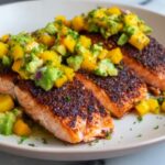 - Serve: Plate the grilled salmon and top each fillet generously with the mango avocado salsa. Serve with additional lime wedges on the side for extra brightness if desired.