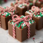 6. Add Sprinkles: Quickly top the surface with the red and green holiday sprinkles. Gently press them into the fudge so they adhere as it sets.