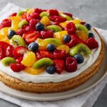 Spread the frosting evenly over the cooled cookie crust, making sure to cover every inch for balanced flavor in every bite. Now comes the fun part: decorating! Arrange your strawberries, blueberries, raspberries, kiwi slices, mango chunks, and mandarin orange segments in an attractive pattern. Don’t be shy—let the colors pop and get creative with the layout to make each slice as visually delightful as it is delicious.
