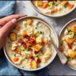 This creamy chicken noodle soup with mini croutons is a comforting and hearty meal perfect for any day. Tender chicken breast, crispy bacon, fresh vegetables, angel hair pasta, and a velvety milk-based broth come together to create a rich and flavorful soup topped with crunchy homemade croutons.