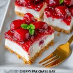 Want to impress guests? Serve your No-Bake Cherry Cheesecake Bars Recipe on a pretty platter lined with fresh mint leaves or edible flowers. For parties, cut them into bite-sized squares, place them on decorative toothpicks, and arrange on a tiered stand to make them easy to grab and enjoy.