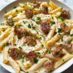 Sausage Alfredo Rigatoni is a rich and creamy Italian-American pasta dish featuring tender rigatoni tossed in a luscious homemade Alfredo sauce with flavorful Italian sausage. This comforting main course combines the savory spiced sausage with a velvety blend of heavy cream and Parmesan cheese, perfectly balanced with garlic and a hint of red pepper flakes for subtle heat. Garnished with fresh parsley, it makes a satisfying and elegant dinner that’s easy to prepare on the stovetop.