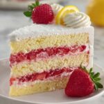 Fresh strawberries and thin lemon slices are the perfect way to garnish this cake. They echo the cake’s core flavors while adding a beautiful, natural decoration that says fresh and inviting. A sprinkle of edible flowers or mint leaves can add an elegant touch if you want to impress guests.